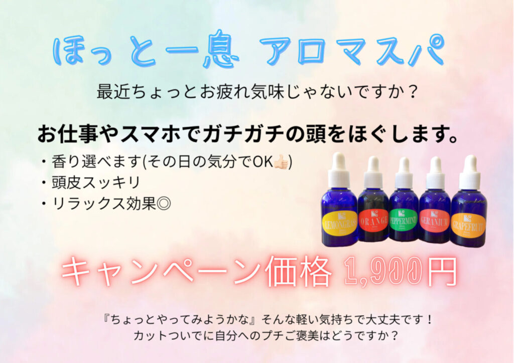 当店の【ほっと一息アロマスパ】はお仕事やスマホ疲れの頭をやさしくゆるめます🌿