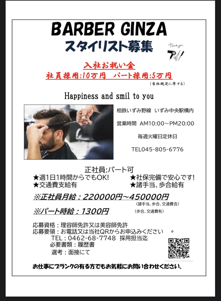 ⭐️短時間アルバイトも募集しております⭐️#横浜市泉区理容室銀座#横浜ビューティーアート#横浜fカレッジ#町田美容専門学校#山野美容専門学校#早見芸術学院#Y校別科#山野芸術短大#横浜国際ビューティーカレッジ#湘南ビューティーカレッジ#スタッフ募集#相鉄線いずみ中央駅社会保険完備#交通費支給#盲導犬